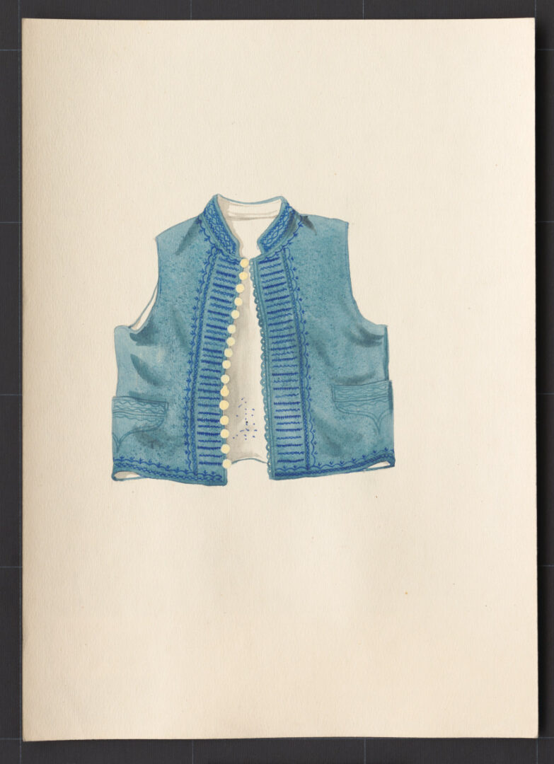 Lajblík, Lubina, začiatok 20. storočia. Lajblík (kamizol) je ušitý z bledomodrého tenkého súkna a podšitý bielym flanelom. Má rovný strih, dva šosíky a siaha do pása. Nízky stojatý golier, okraje lajblíka a najmä obe strany zapínania zdobí modrá harasová výšivka. Lajblík spolu s bledomodrými nohavicami patril k základným odevným súčiastkom, ktoré nosili v zimnom období vo sviatočné dni slobodní mládenci i mladí ženatí muži. Staršie, obnosené lajblíky sa obliekali aj vo všedné dni.