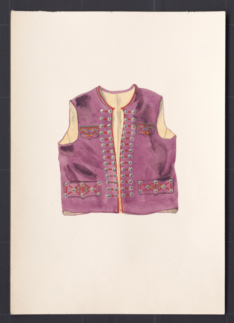 Lajblík, Záriečie, začiatok 20. storočia. Lajblík je ušitý z červenofialového tenkého súkna a podšitý hrubším domácim ľanovým plátnom. Má rovný strih s tromi šosíkmi. Siaha do pása. Nezapína sa, kovové gombíky slúžia len ako ozdoba. Zadný diel a záklopky vreciek zdobí vlnená výšivka. Lajblíky nosili muži po celý rok – vo všedné dni staršie, obnosené a vo sviatočné dni nové. Starší muži mali lajblíky menej zdobené ako mladší muži a slobodní mládenci.