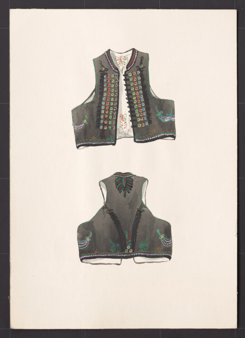 Sviatočný lajblík mladého muža, Čierne nad Topľou, druhá štvrtina 20. storočia. Lajblík je z jemného továrenského čierneho súkna a podšitý bavlneným plátnom. Má nízky stojatý golier, zapína sa na rad menších kovových gombíkov. Po oboch stranách má malé všité vrecká. Výzdoba na chrbte a po stranách je z čiernej a zo zelenej šujtášovej šnúrky, ktorá je doplnená farebnou výšivkou. Pozdĺž zapínania sú našité po tri rady kovových gombíkov, vykladaných farebnými sklíčkami. Lajblíky sa šili aj z čierneho zamatu. Ženatí a starší muži nosili lajblíky bez výzdoby.