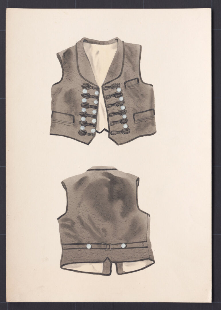 Lajblík, Opatová, začiatok 20. storočia. Lajblík je ušitý z čierneho zamatu a podšitý bielym flanelom. Má oblý preložený golier. Okraje lajblíka sú obšité čiernou hodvábnou stužkou. Lajblík sa zapínal na rad kovových gombíkov a pozamentových slučiek, z ktorých bola aj výzdoba pozdĺž zapínania. Nosil sa v letnom období k plátenným gatiam a v zimnom období k súkenným nohaviciam. V 19. storočí sa lajblíky šili z čierneho súkna, nemali golier a zapínali sa až ku krku.