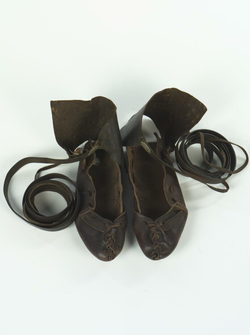 Krpce kožené, mužské – pár: obuv zhotovená z jednoho kusu kože, zošitá na vnútornej strane priehlavku (v palcovej časti) koženým remienkom, prevlečeným otvormi na okraji k pätovej časti, kde sa pripevňuje k nohe. Spojovací kožený pás na jednej strane priehlavku zdobený vtlačenými jednoduchými linajkami a poloblúčikmi. Na uväzovací pásik je kovovou sponou pripevnený široký plát kože na obalenie kotníka, cez ktorý sa upínací pás obkrúcal.