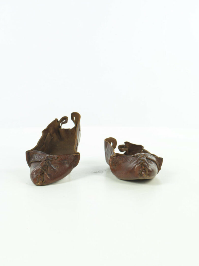 Krpce kožené, mužské – pár: zhotovené z jednoho kusu, uprostred na priehlavku zošité dlhým pásikom kože, prevlečenom na vnútornej strane obuvi k pätovému rázporku. Širšia časť pásika zdobená vtláčanými geometrickými ornamentálnymi motívmi, rovnako ako aj priehlavok s dvoma rozetkami.