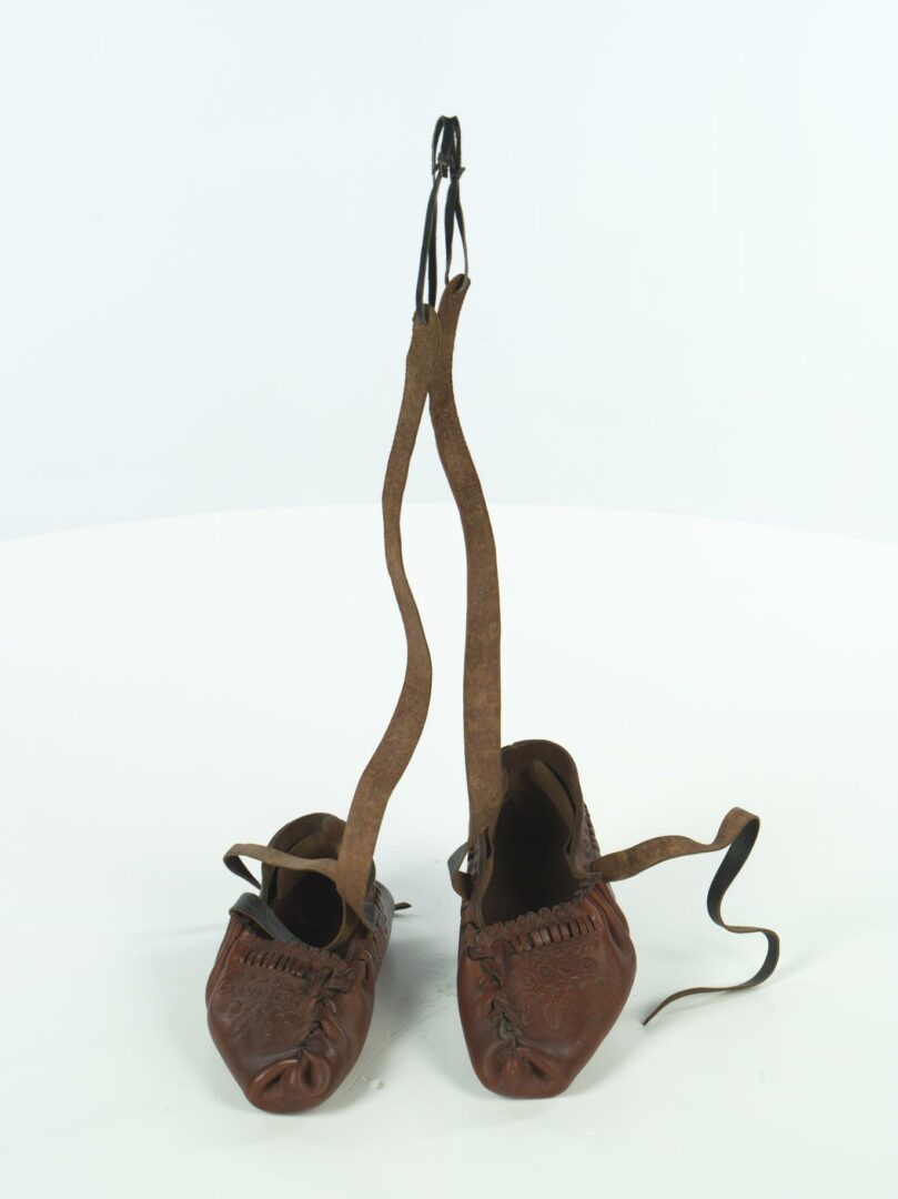 Pár mužských krpcov šitých z jednoho kusu kože, zošité na pätovej časti a na palcovej časti priehlavku koženým pásikom, na hornej časti priehlavku vytláčaný dekor s rastlinným motívom listov a rozetiek.