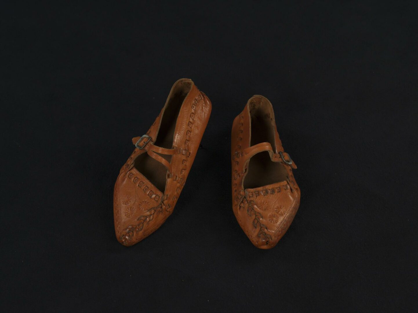Krpce kožené – pár, zhotovené z jednoho kusu kože, zošité na pätovej časti a na vnútornej strane priehlavku koženým tremienkom. Cez nárt remienok s prackou. Horná časť priehlavku zdobená vytláčaným dekorom s rastlinným motívom trojíc kvetov. Pár ženských krpcov, hovädzia koža, zdobené po obvode bodkami v pásoch razidlami, v prednej časti motív kvetov (púpavy).