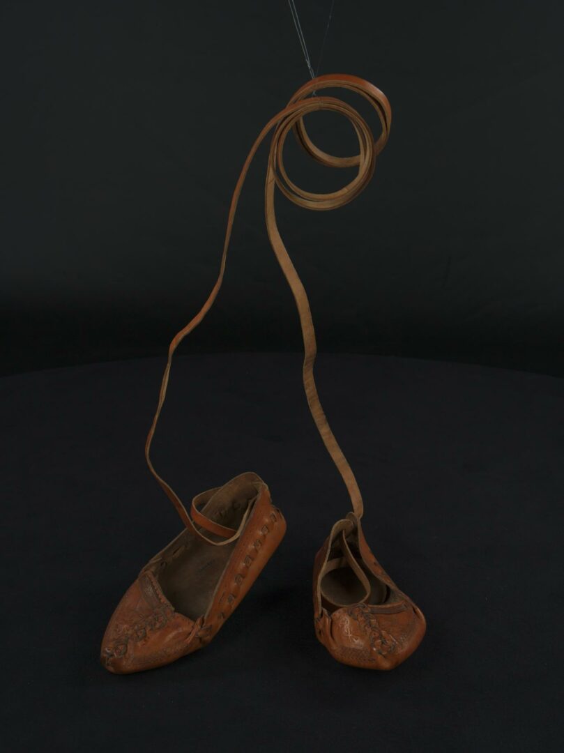 Pár mužských krpcov, zhotovené z jednoho kusu kože, zošité na pätovej časti a na pravej palcovej strane priehlavku koženým remienkom. Priehlavok zdobený vypaľovanými kvetmi, bodkami a narezávanou mriežkou. Okolo krpca sú tiež vypaľované bodky, usporiadené do úzkeho pásiku. Krpce sa pripevňujú na nohu návlakmi. Krpce sa šijú z obdĺžnikového kusa hovädzej kože. Výrobca: Joachim Venglár.