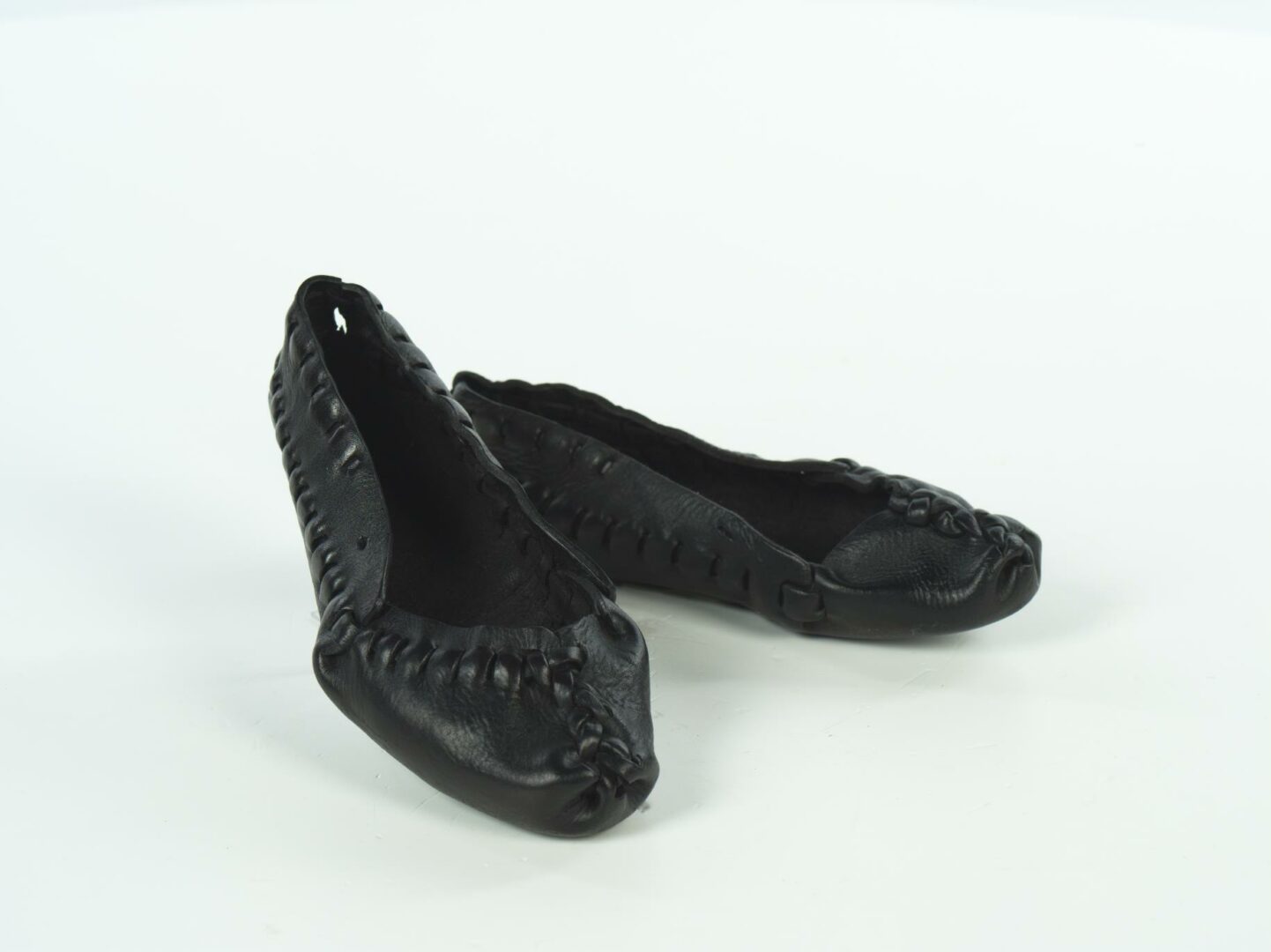 Krpce kožené ženské, čiernej farby, priehlavok a päta zošité narezanými koženými pásikmi. Úprava päty je novšia, pôvodne bývala otvorená.