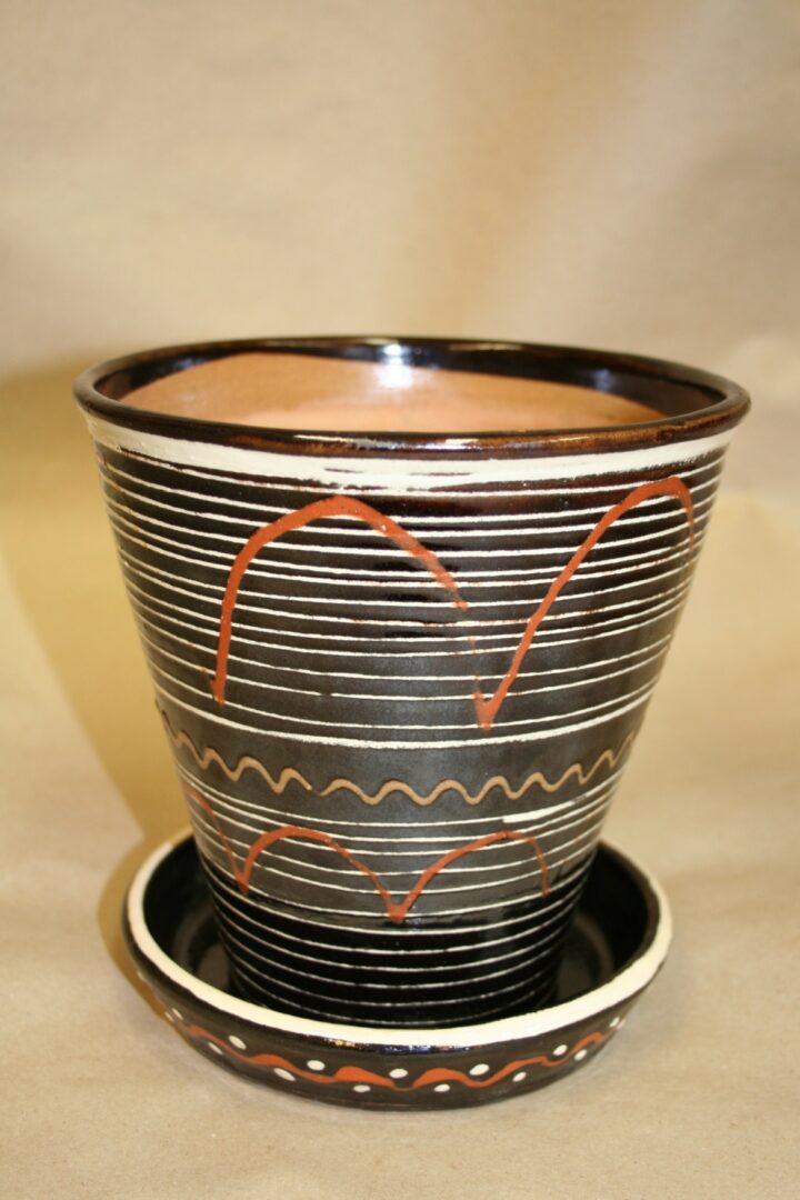 Ručne točená na hrnčiarskom kruhu, poliata tmavohnedou až čiernou hlinkou maľovaná pomocou kukučky (rožka) bielou hlinkou a farebnýmí hlinkami geometrický a rastlinný dekor, transparentná bezfarebná glazúra.