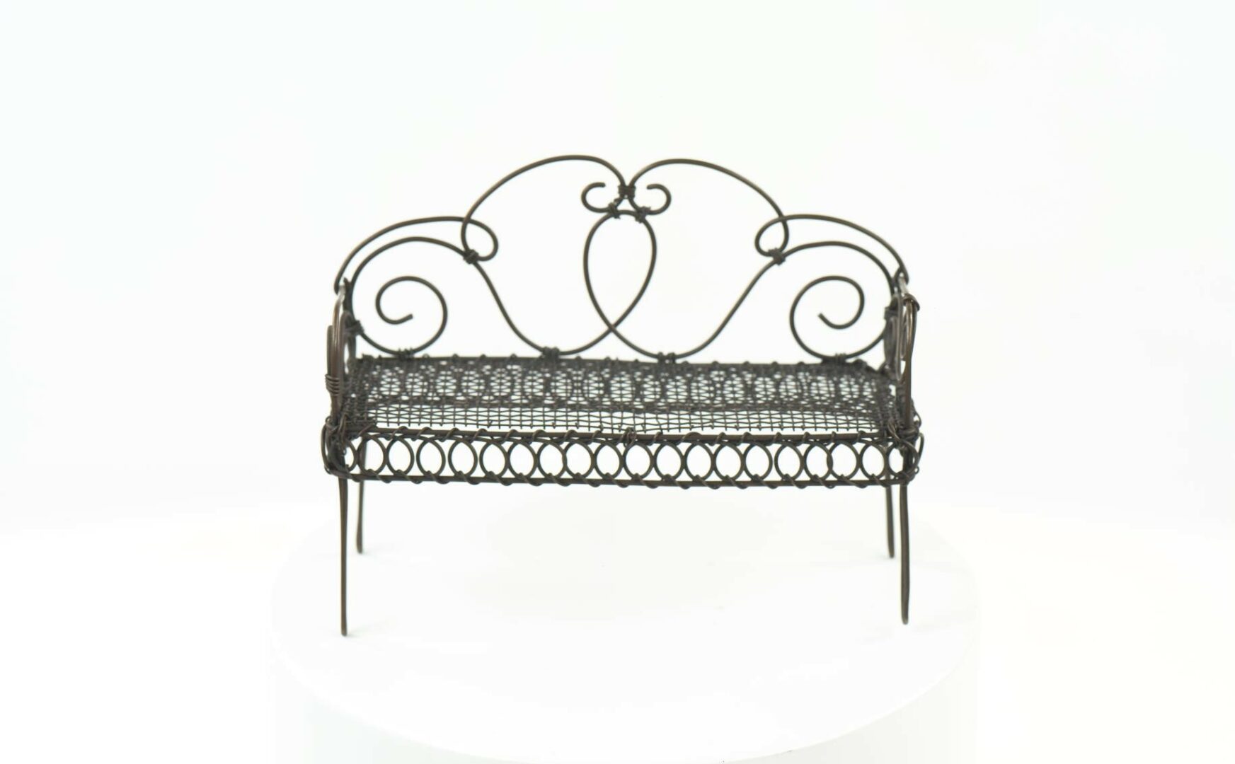 Drôtená miniatúrna lavica na sedenie vyrobená z počierneného drôtu.
