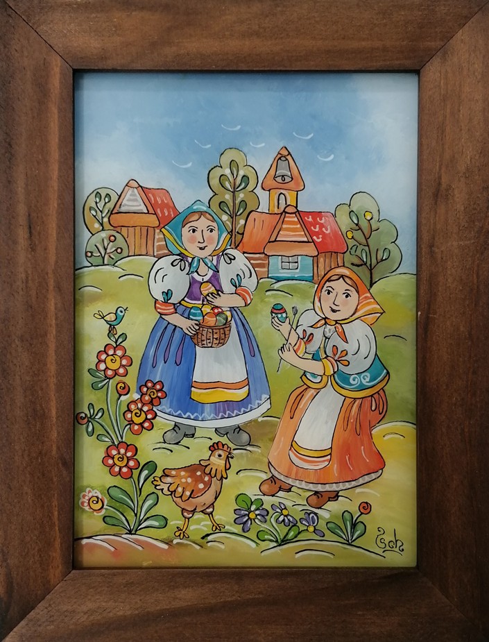 Obraz v drevenom ráme je zhotovený technikou podmaľby na skle.