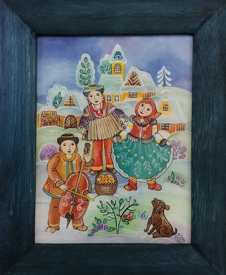 Obraz v drevenom ráme je zhotovený technikou podmaľby na skle.