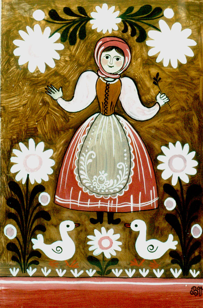 ÚĽUV / Výrobky / Maľba na sklo – Dievča s kačkami