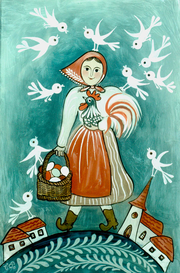 ÚĽUV / Výrobky / Maľba na sklo – Dievča s kohútom