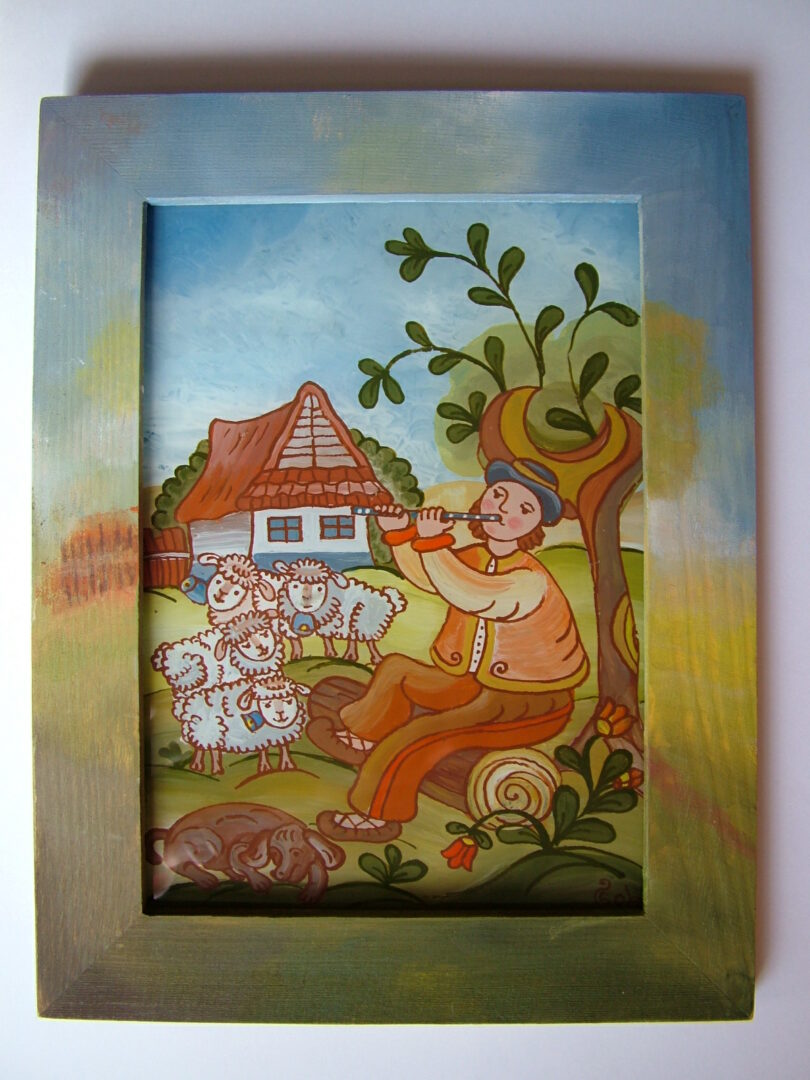 ÚĽUV / Výrobky / Maľba na sklo – Pastierik s ovečkami