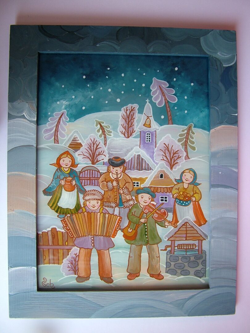 ÚĽUV / Výrobky / Maľba na sklo – Zima, muzikanti