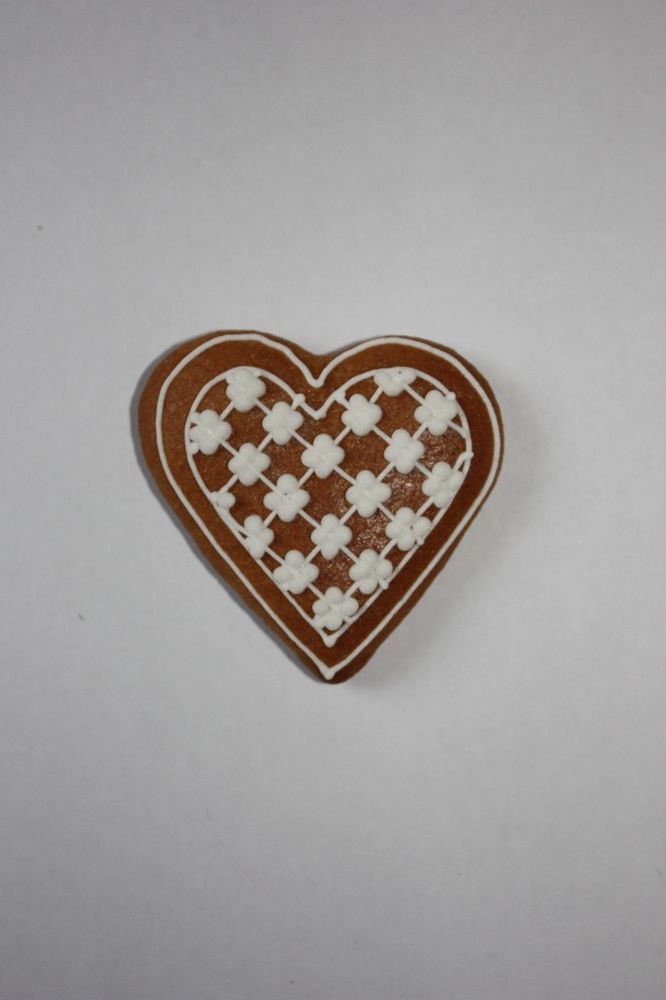 je zdobený bielou polevou jednoduchým kornútikom. Na prípravu cesta je použitý tradičný materiál med, muka, cukor, vajíčka, voda a perníkové korenie.
