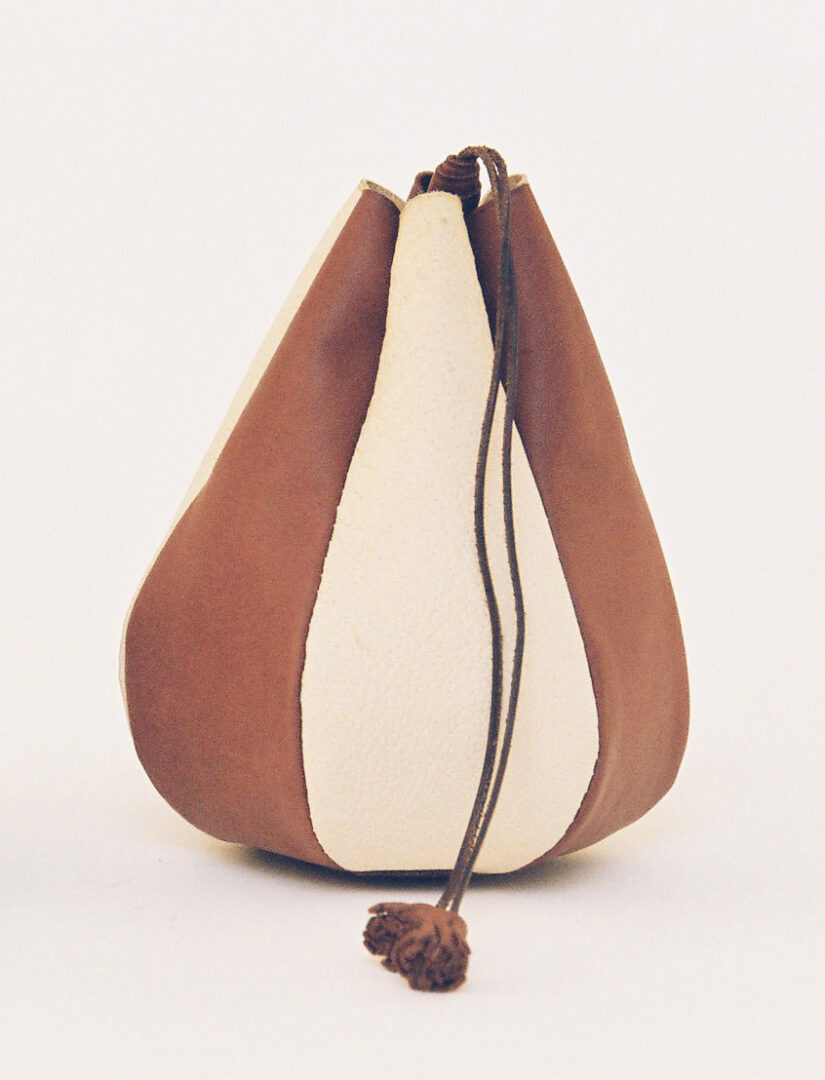 Šitý z dvoch druhov farebných teľacích koží, šiestich častí, kožená šnúrka na stiahnutie s kovovými očkami a ozdobnými strapčekmi na ukončenie.
