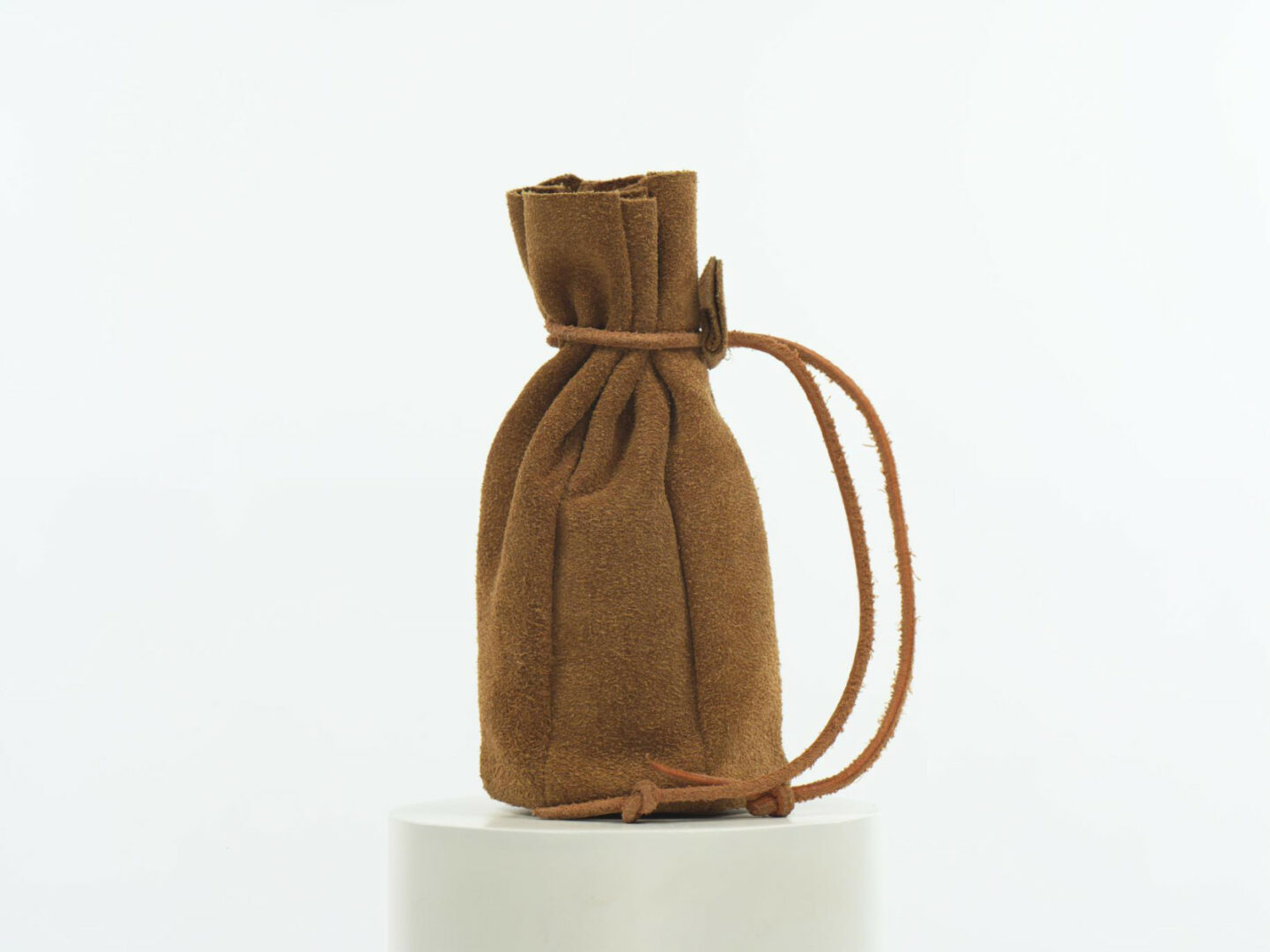 Mešec kožený, ušitý z béžových semišových pásikov na kruhovom dienku, pri ústi sťahovaný koženou šnúrkou, našitou do jedného zo švíkov.