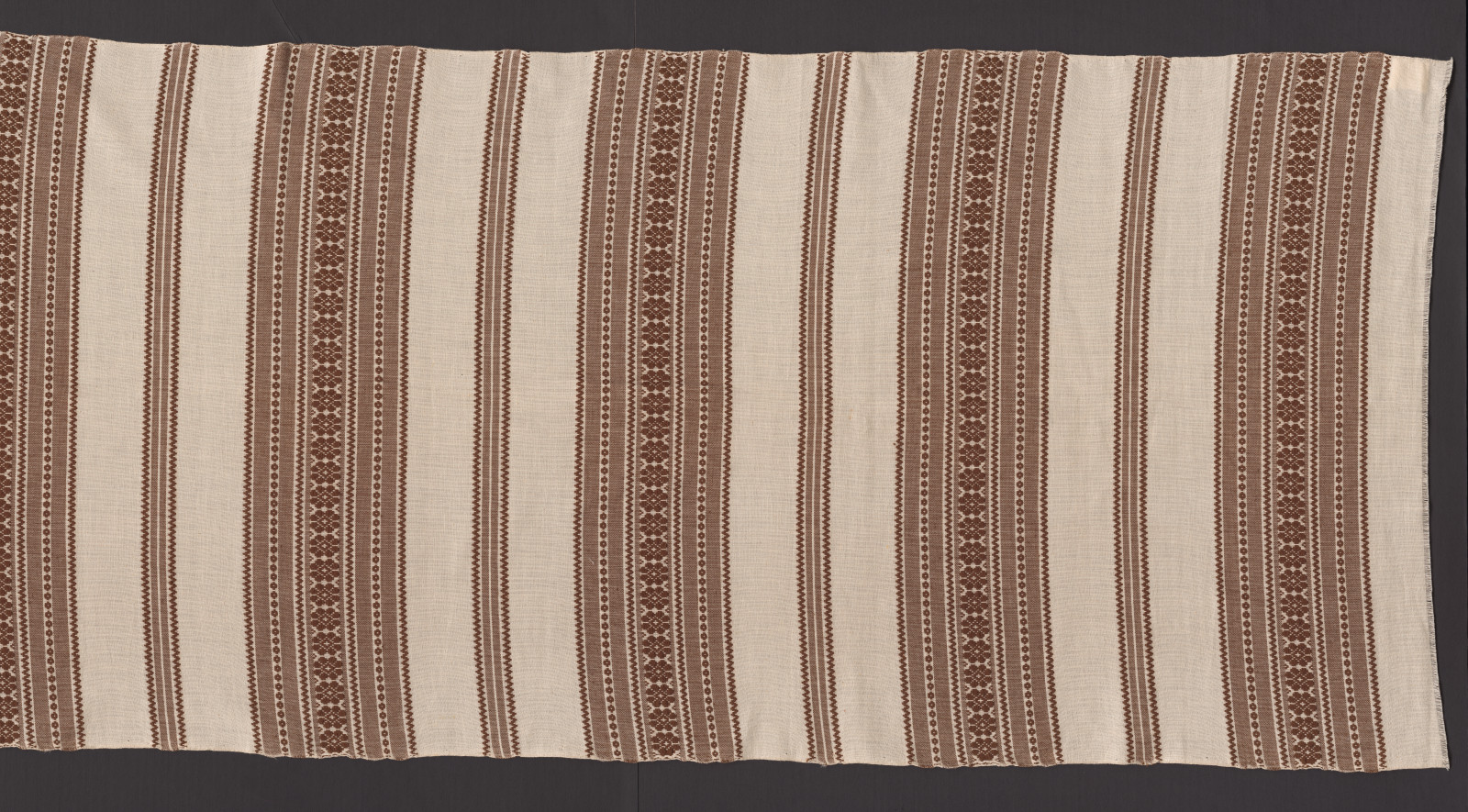 Metráž ručne tkaná s motívmi z Važca. Na bavlnenom plátne sú motívy zhotovené preberaním a kockovaním tmavohnedou bavlnenou niťou. Navrhla: Oľga Koreňová Vyrobila: Mária Ilavská, Važec