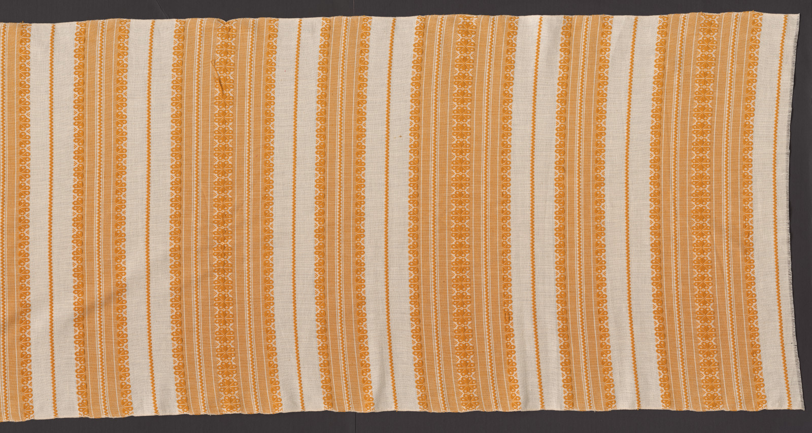 Metráž ručne tkaná s motívmi z Važca. Vzorovanie je robené farebným útkom, kockovaním a preberaním, pásy sa pravidelne striedajú v rytme a b a b. Navrhla: Oľga Koreňová Zhotovila: M. Ilavská, Važec