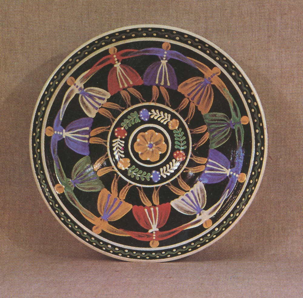 Ručne točená na hrnčiarskom kruhu, poliata tmavohnedou až čierniu (bielou) hlinkou, maľovaný farebnými hlinkami figurálny motív tancujúcich dievčat držiacich sa za ruky v kole – pôvodný výtvarný návr Júlie Horovej z päťdesiatich rokov 20. storočia, transparentná bezfarebná glazúra.