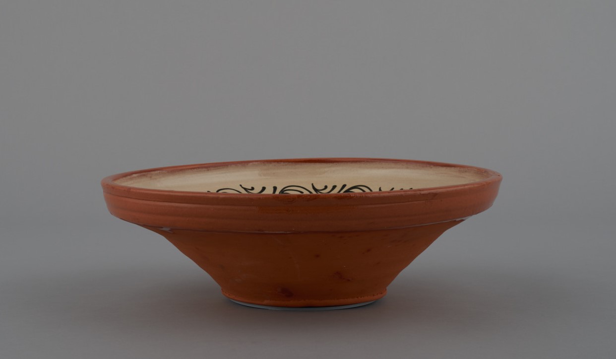 Misa keramická, z červenej hliny, točená na kruhu, hlboká s vyvýšenými zahnutými okrajmi. Dekor: na dne štylizovaný kvet, po obvode pás z oblúčikov. Farebnosť: hnedý, zelený, modrý, čierny dekor na bielom podklade. Priehľadná glazúra.