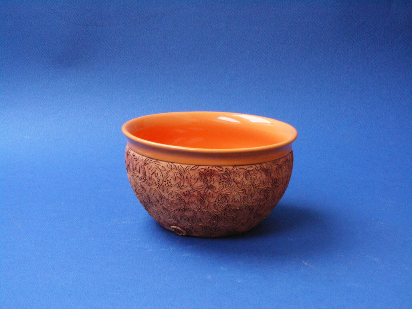 Ručne točená z bledej hliny, zdobená je rytým jemným rastlinným vzorom, prekrytým červenohnedou hlinkou, zvnútra transparentná bezfarebná glazúra.