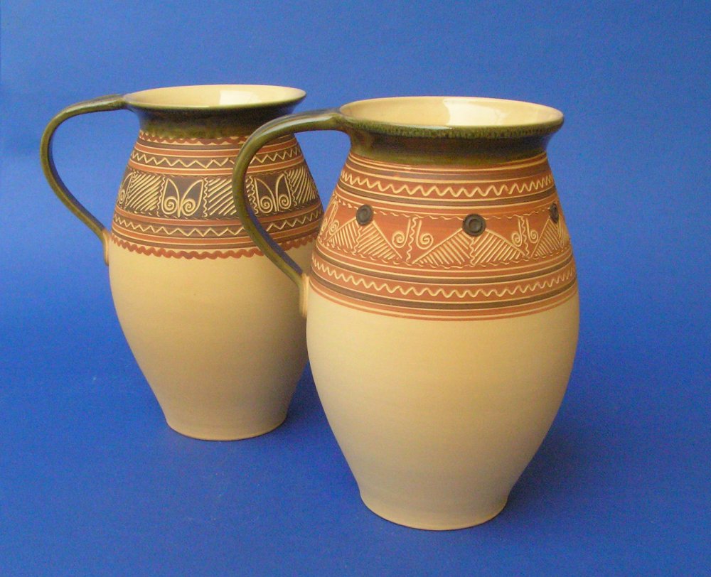 Mliečnik vyrobený podľa tradičných predlôh z Gemera.Ručne točený na hrnčiarskom kruhu z bielej hliny,zdobený pásovým dekorom pod hrdlom nádoby nanesením tmavohnedej,červenohnedej hlinky- široká vlnovka, tenké vlnovky, vyškrabovaním a maľovaním rôznych variácií geometrických dekorov. Zvnútra glazovaný transparentnou bezfarebnou glazúrou,hrdlo zvonka a ucho zelenou a väčšia časť nádoby zvonka bez glazúry. Vysoký výpal zabezpečuje vysoké úžitkové vlastnosti.