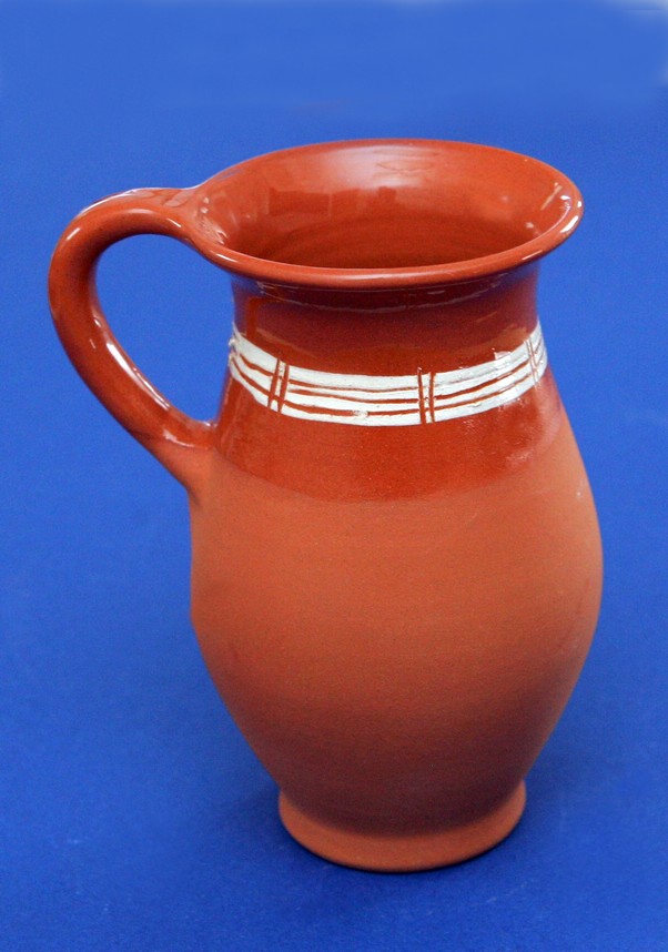 Ručne točený na hrnčiarskom kruhu, zdobený pásom bielej hlinky na hrdle nádoby prerýhovanným troma linkami a hvertikálnymi čiarkami, transparenrná bezfarebná glazúra do vrchnej tretiny, zvyšok bez glazúry.