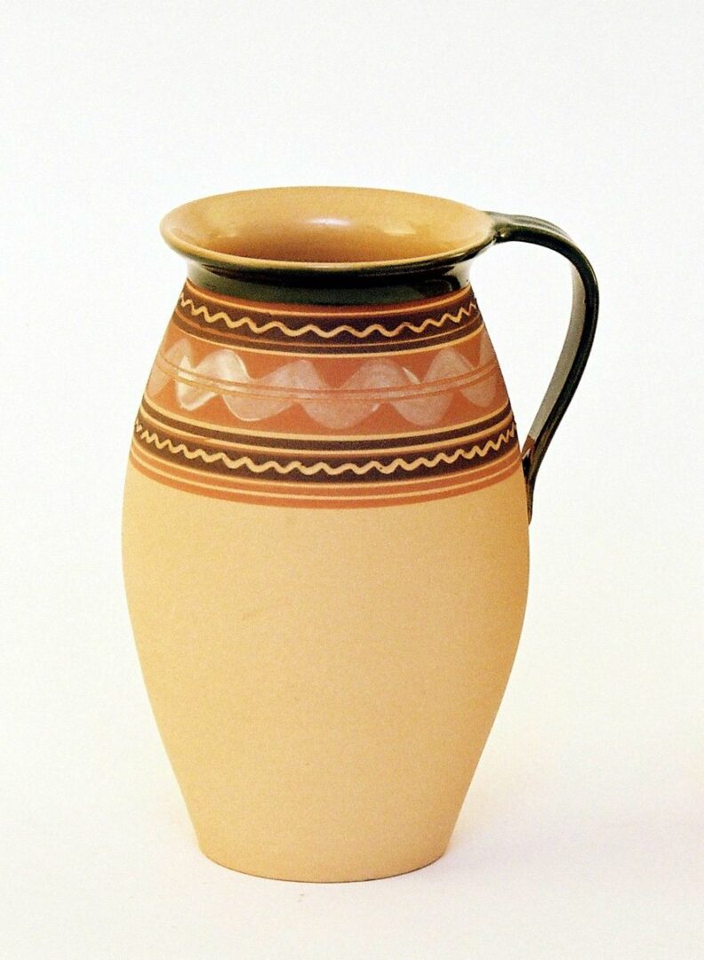 Mliečnik vyrobený podľa tradičných predlôh z Gemera. Ručne točený na hrnčiarskom kruhu z bielej hliny,pod hrdlom nanesený pás resp. vlnovky z tmavohnedej, červenohnedej hlinky,na ňom maľ. a vyškrabované variácie geometrických vzorov,alebo maľ.hrubá vlnovka .Zvnútra glazovaný transparentnou bezfarebnou glazúrou, hrdlo zvonka a ucho zelenou a väčšia časť nádoby zvonka bez glazúry. Vysoký výpal zaručuje vysoké úžitkové vlastnosti.