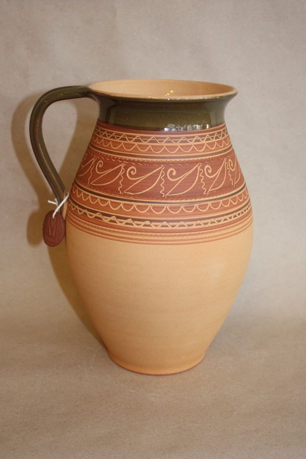 Mliečnik vyrobený podľa starých tradičných predlôh z Gemera. Ručne točený na hrnčiarskom kruhu z bielej hliny, zdobený pásovým dekorom pod hrdlom nádoby nanesením tmavohnedej, červenohnedej hlinky – široké a tenké vlnovky, vyškrabované a maľované rôzne geometrické dekory. Zvnútra glazovaný transparentnou bezfarebnou glazúrou, hrdlo zvonka a ucho zelenou a väčšia časť nádoby zvonka bez glazúry. Vysoký výpal zaručuje vysoké úžitkové vlastnosti.