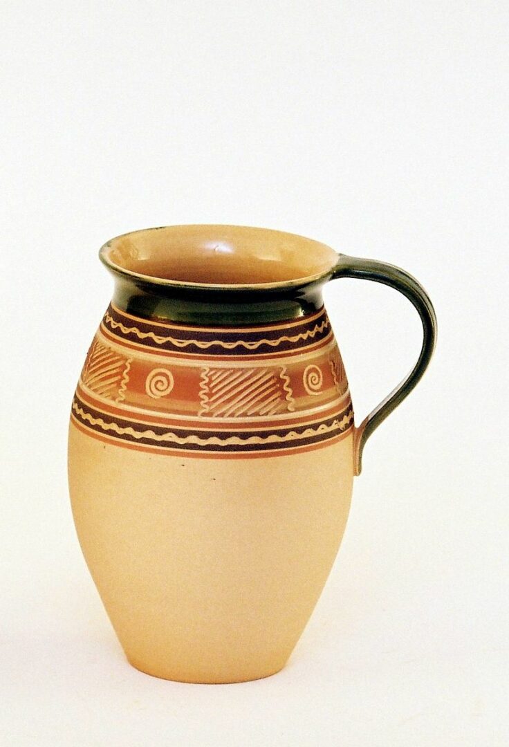 Mliečnik vyrobený podľa starých tradičných predlôh z Gemera. Ručne točený na hrnčiarskom kruhu z bielej hliny, zdobený pásovým dekorom pod hrdlom nádoby nanesením tmavohnedej, červenohnedej hlinky – široké a tenké vlnovky, vyškrabovaním a maľovaním rôznych geometrických dekorov. Zvnútra glazovaný transparentnou bezfarebnou glazúrou, hrdlo zvonka a ucho zelenou a väčšia časť nádoby zvonka bez glazúry. Vysoký výpal zaručuje vysoké úžitkové vlastnosti.