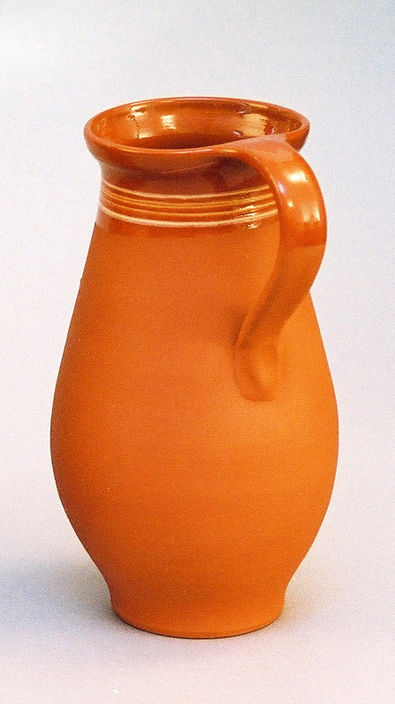 Ručne točený na hrnčiarskom kruhu z červenej hliny, zdobený štyrmi bielymi linkami na hrdle, zvnútra transparentná bezfarebná glazúra, zvonka neglazovaný.