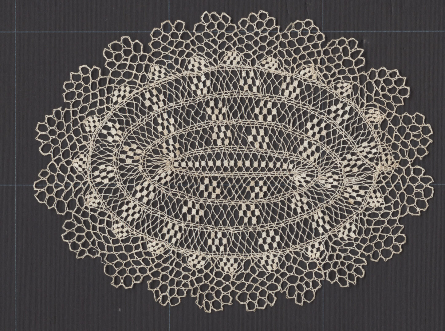 Prikrývka z paličkovanej čipky. Charakteristická čipka banícka, zv. „cingerla“. Materiál biela bavlnená niť, väzby jedno a dvojpárové pletence, dierky, ploštičky, tylová väzba.