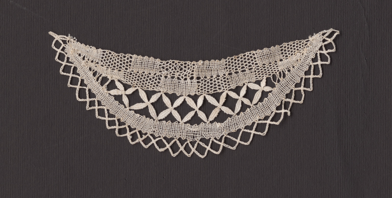Motív z paličkovanej čipky. Materiál je biela bavlnená niť na šitie, väzby dvojpárové pletence, plátenko, polpára, lístky.