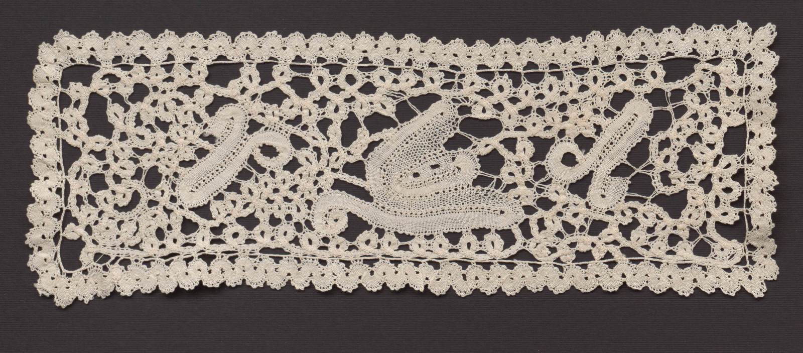 II. Paličkovaný motív navrhla E. Marková. Plátenkový pásik na motív husej tlapky doplnený ploštičkou. Materiál je ecru bavlnená niť na háčkovanie. Väzby plátenko, pikotky, jednopárové pletence ako spojky.
