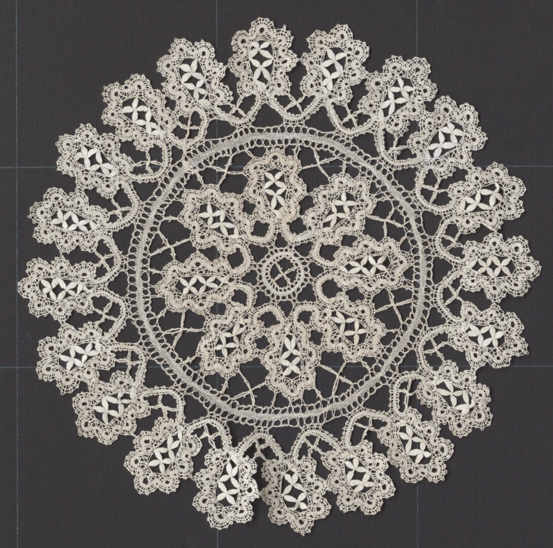 Celopaličkovaný motív okrúhleho tvaru vyrobený z jemnej bielej ľanovej priadze. Čipka je pásiková, väzby plátenko, pletenec, lístočky.