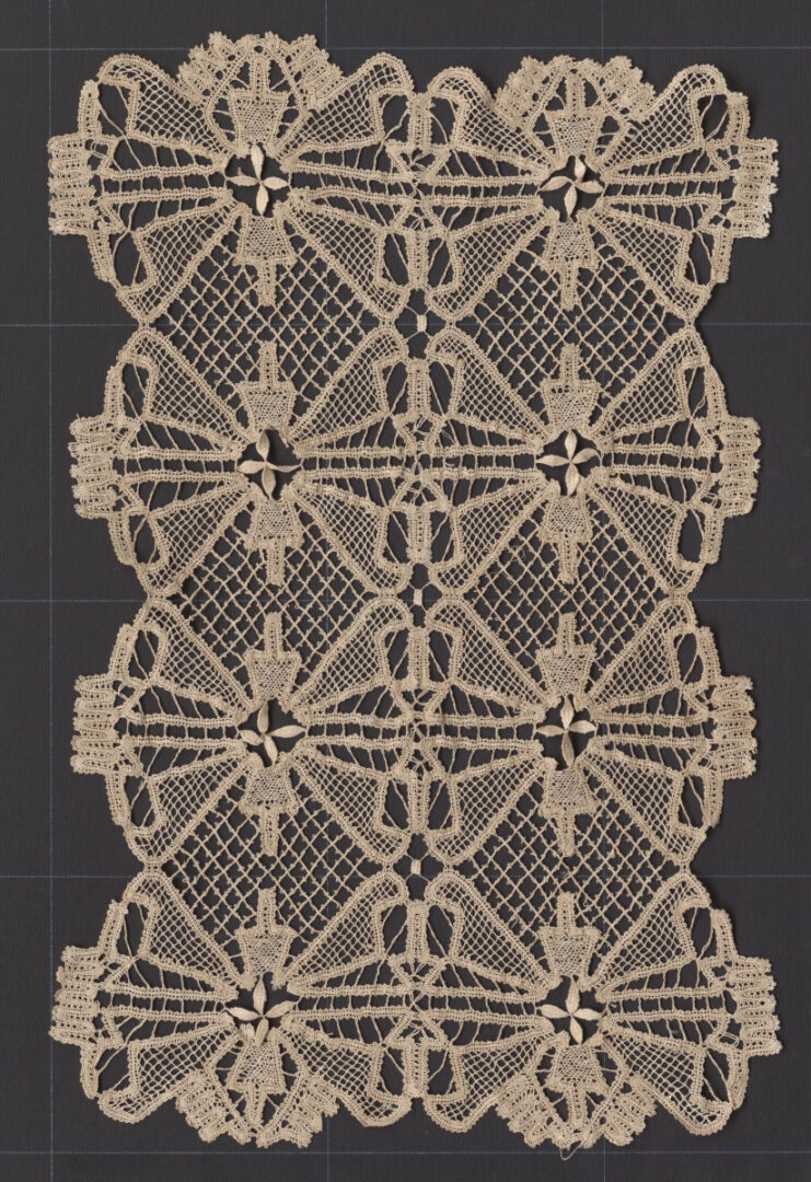 Paličkovaná prikrývka, pásikový charakter, z tenkých ecru nití. Väzby polpár, plátenko, dierky, pletence, pikótky a lístky. Motív vtáčikov proti sebe sediacich. Vyrobili Štátne dielne čipkárske v Hodruši.