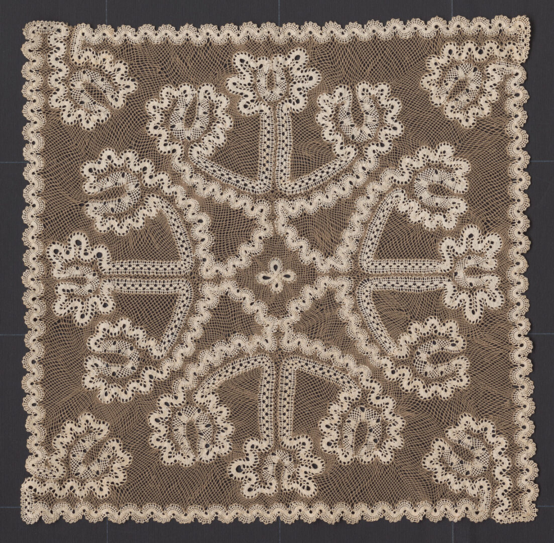 Paličkovaný motív, čipka je pásiková, gemerského charakteru. Materiál biele a režné bavlnené nite, väzby plátenko, dierky, zákrutky a oká.