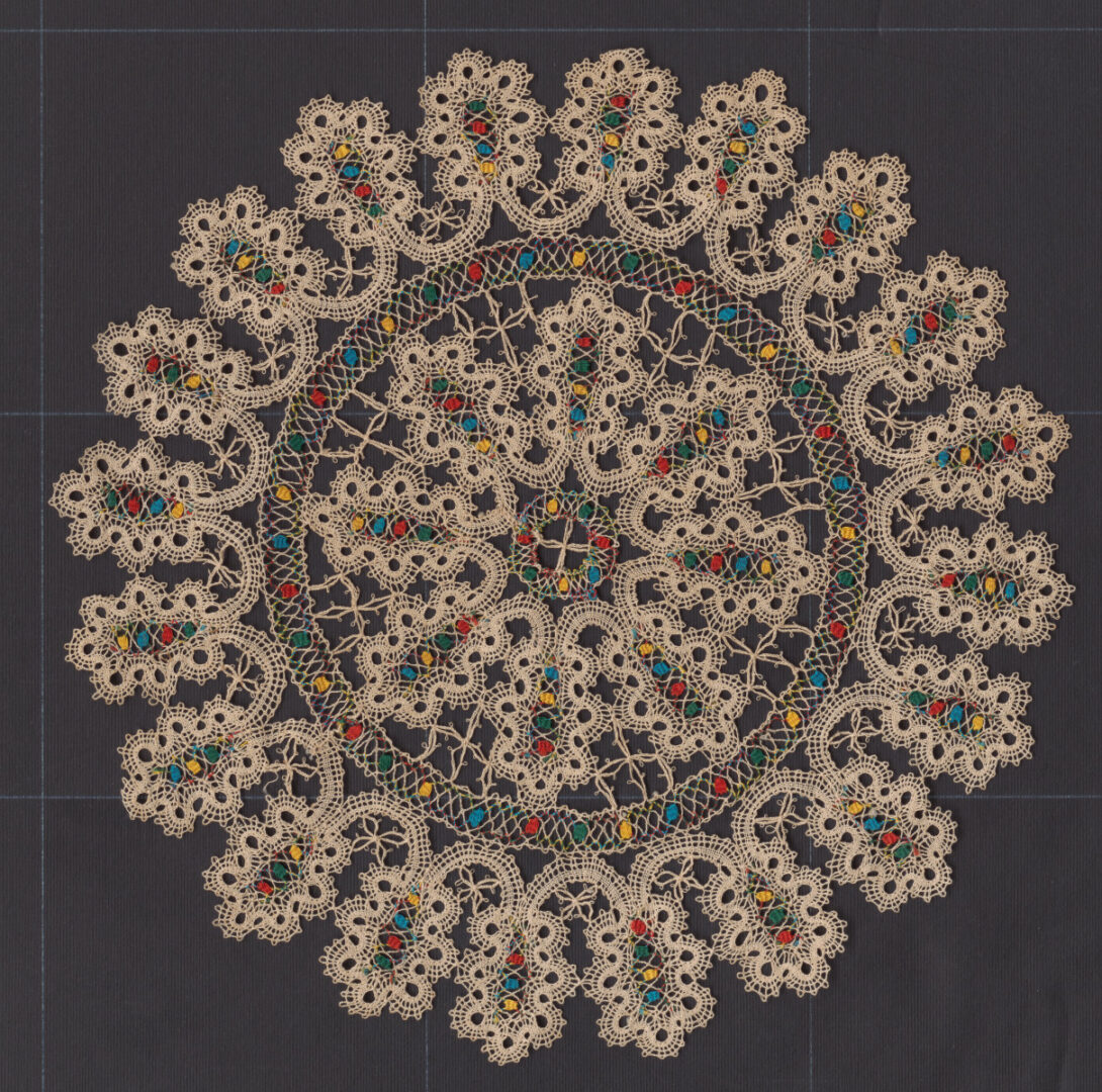 Okrúhla celopaličkovaná prikrývka, typ soľnobanskej čipky. Pásiková čipka, v jej strede farebné ploštičky.