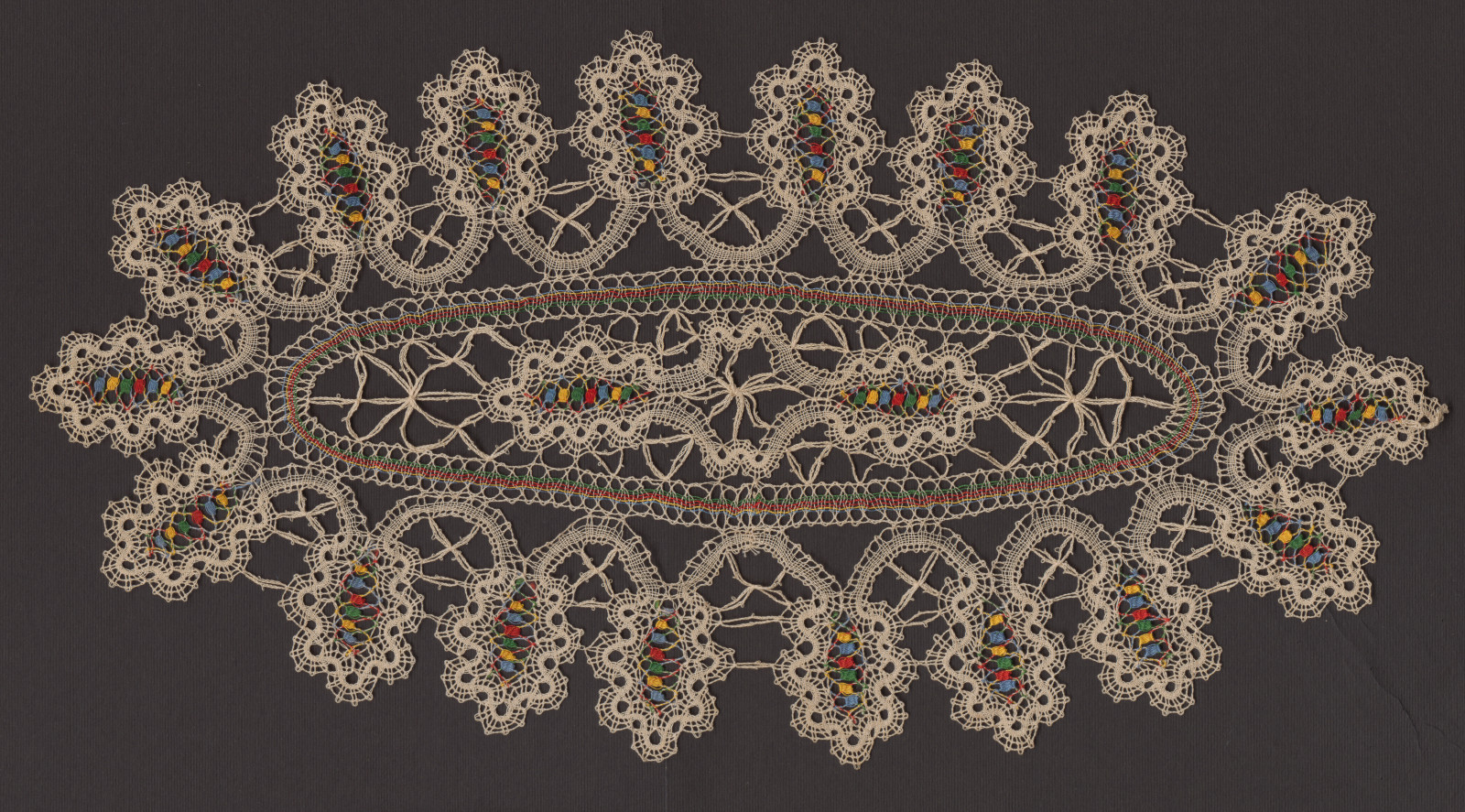 Prikrývka z paličkovanej čipky. Materiál bavlnená nebielená niť a pestré nite na šitie. Väzby jedno a dvojpárove pletence, plátenko hladké a prekladané, dierky, ploštičky a mitky/pikotky. Vzor hruškový.