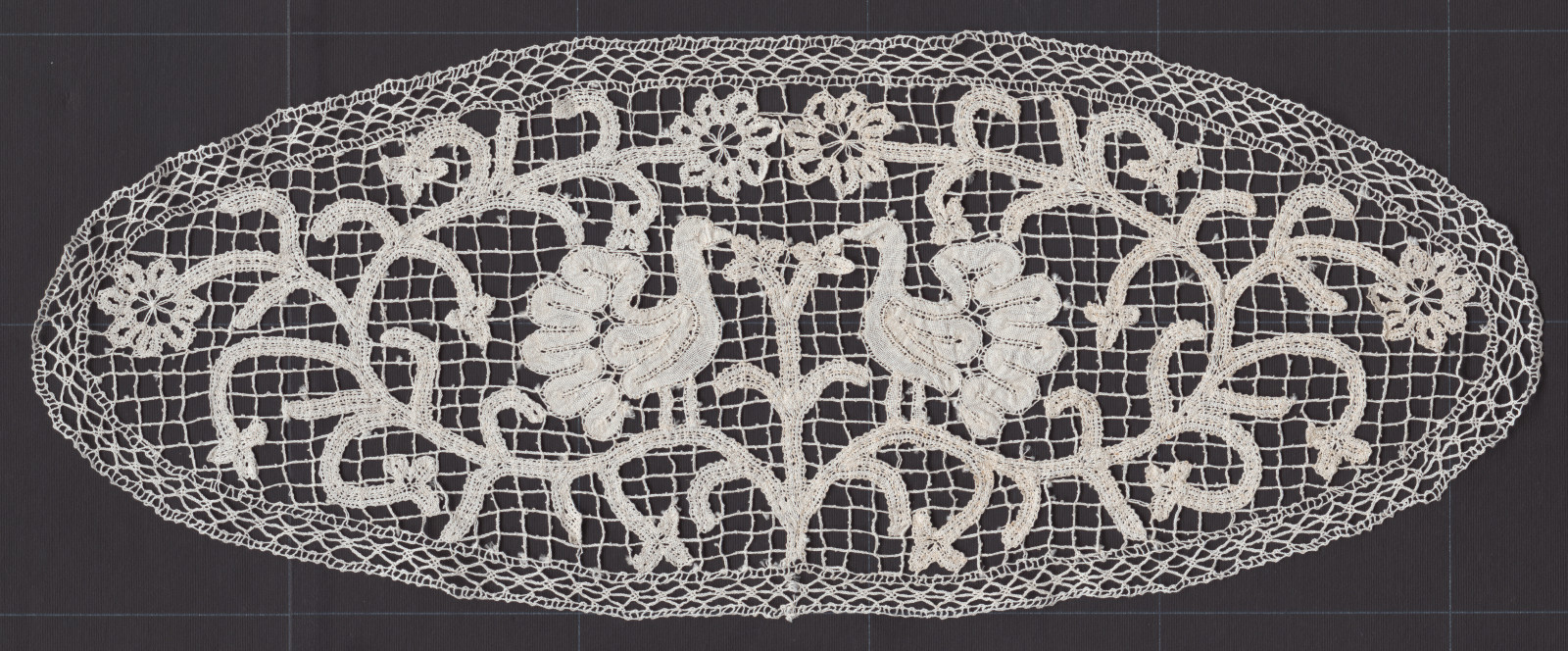 Paličkovaný motív na všívanie. Motív hlucháňa na konári stojaci oproti sebe. Väzby jedno a dvojpárové pletence, obe plátenká, oká a mitky/pikotky.