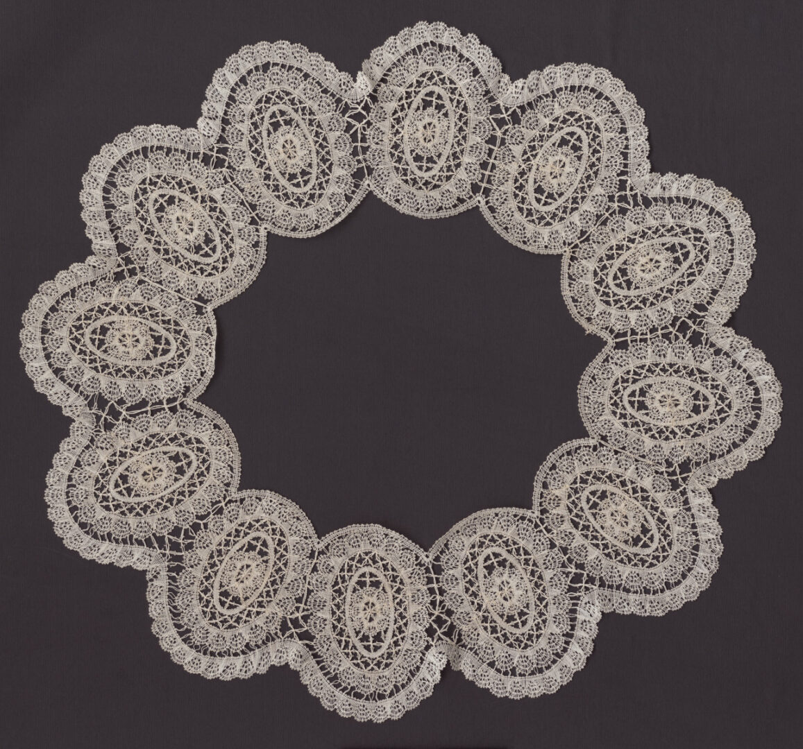 Paličkovaný okolok z bielych tenkých bavlnených nití zostavaný zo samostatných motívov. Typ soľnobanský. Väzby pletence, plátenko, mitky/pikotky.