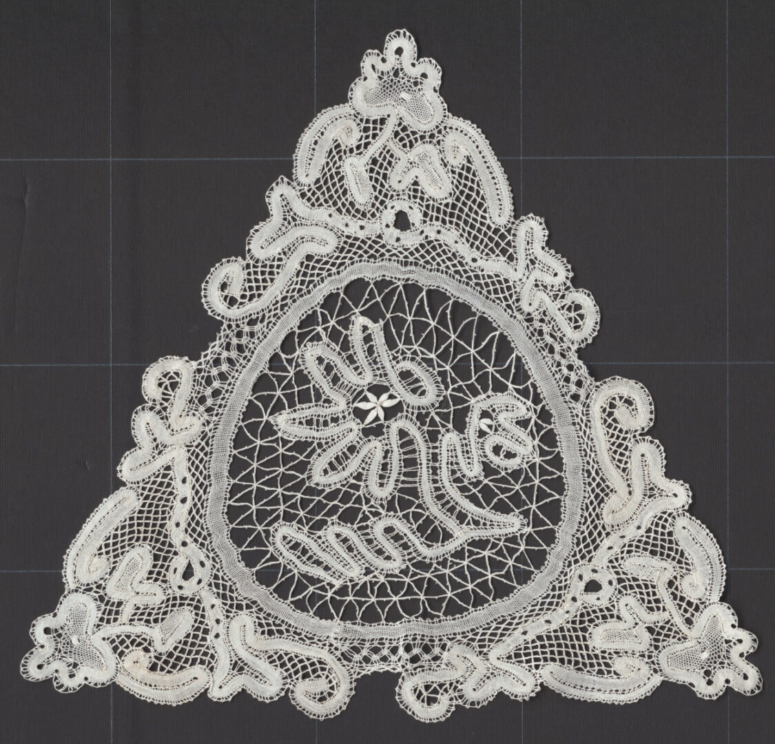 Motív z paličkovanej čipky pásikovej v tvare trojuholníka. Rastlinný štylizovaný motív a rôzne pomiešané štylizované prvky, netypické. Väzby jedno a dvojpárové pletence, hladké plátenko, polpár, lístky, oká a ploštičky.