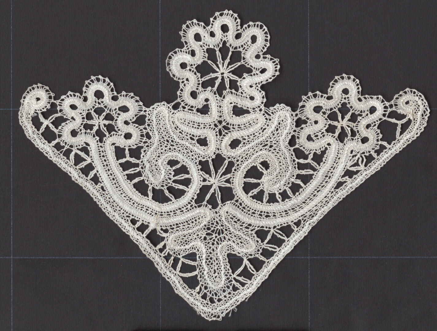 Motív z paličkovanej pásikovej čipky zhotovený z bielych bavlnených nití na šitie a na vyšívanie. Väzby dvojpárové pletence, plátenko, polpára, vplietanie hrubej nite.