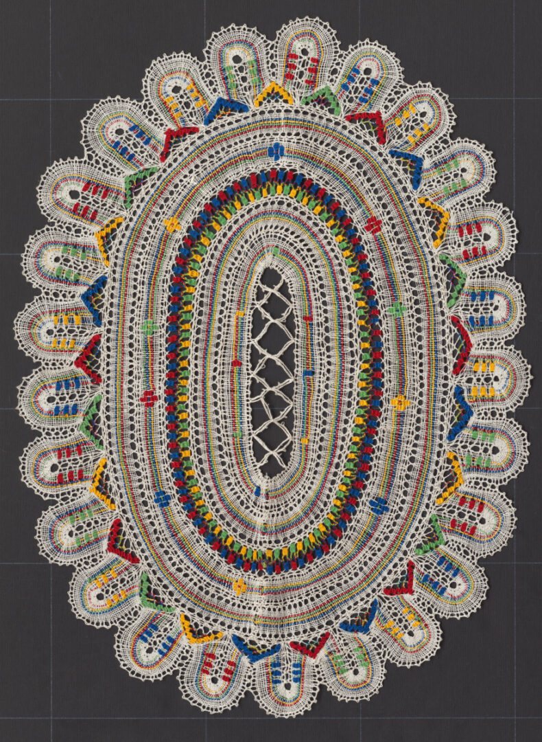Oválna paličkovaná prikrývka, materiál biele ľanové nite a farebné bavlnené nite.