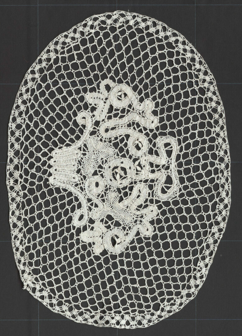 Paličkovaný motív z bielych ľanových nití. Secesný staromódny vzor z pásikovej čipky s riečičkou. Väzby jedno a dvojpárove pletence, polpára, ploštičky, oká, tylová väzba.