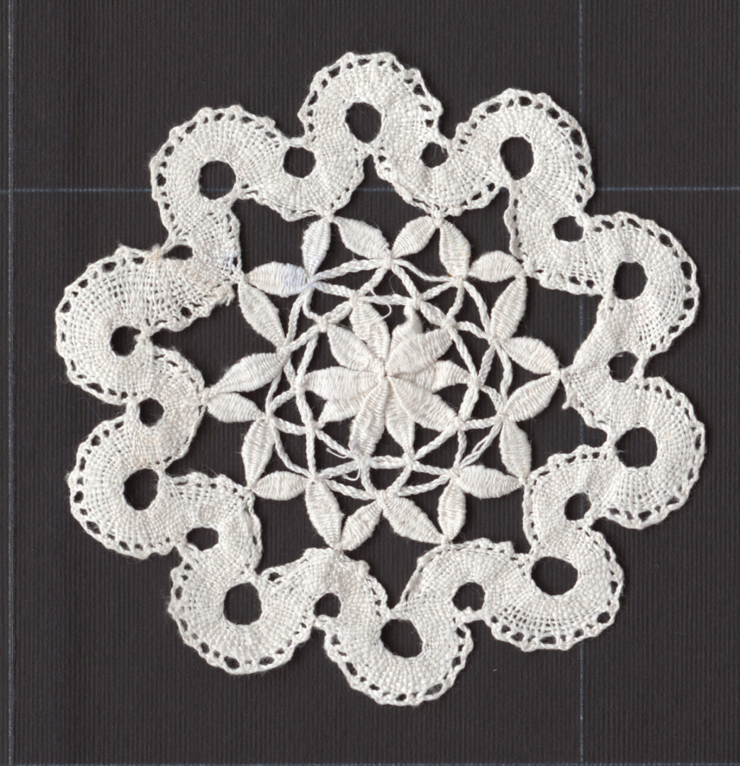Motív z paličkovanej čipky. Materiál – biela ľanová niť na paličkovanie. Väzby pletence, plátenko, oká a lístky.