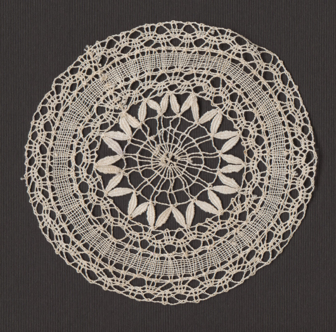 Okrúhly motív na všívanie z paličkovanej čipky. Materiál biela bavlnená niť na šitie. Väzby jednopárové pletence, plátenko hladké a prekladané, lístky.