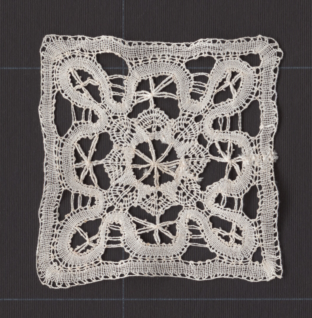 Štvorcový motív z paličkovanej čipky. Materiál biela bavlnená niť na šitie, väzby jedno a dvojpárové pletence, plátenko, pikotky/mitky.