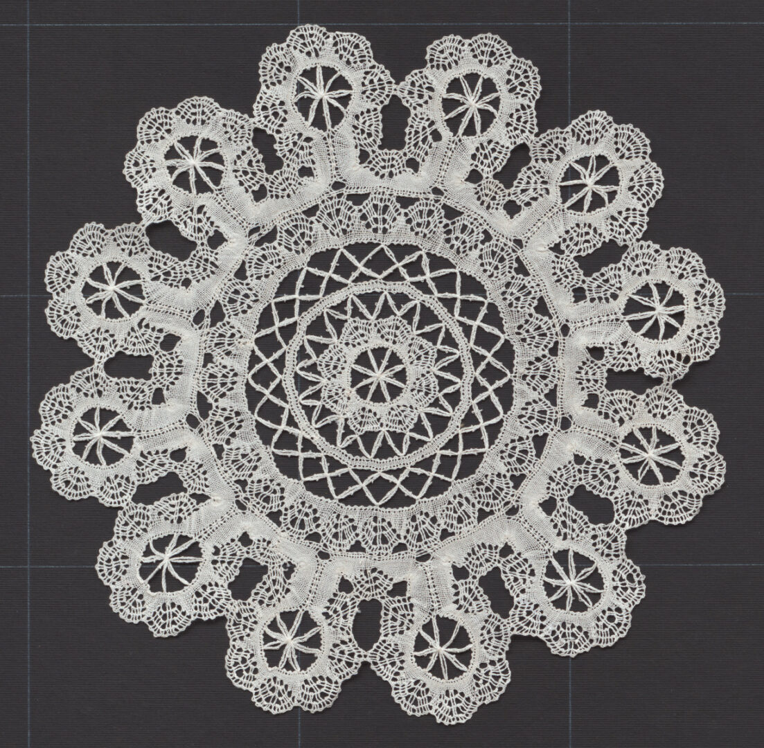 Paličkovaná prikrývka, materiál biela bavlnená niť na šitie, technika jedno a dvojpárové pletence, plátenko hladké a prekladané a pikotky/mitky.